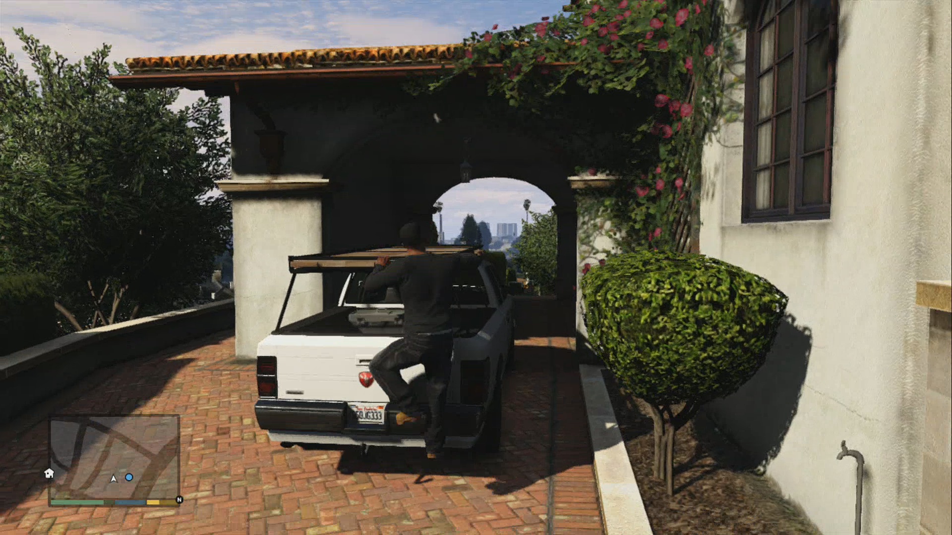 To break into Michael’s house walk up to the gate and climb over it. Enter sneak mode and take out the gardener. Walk to the right side of the house to the parked truck. Jump onto the truck:
