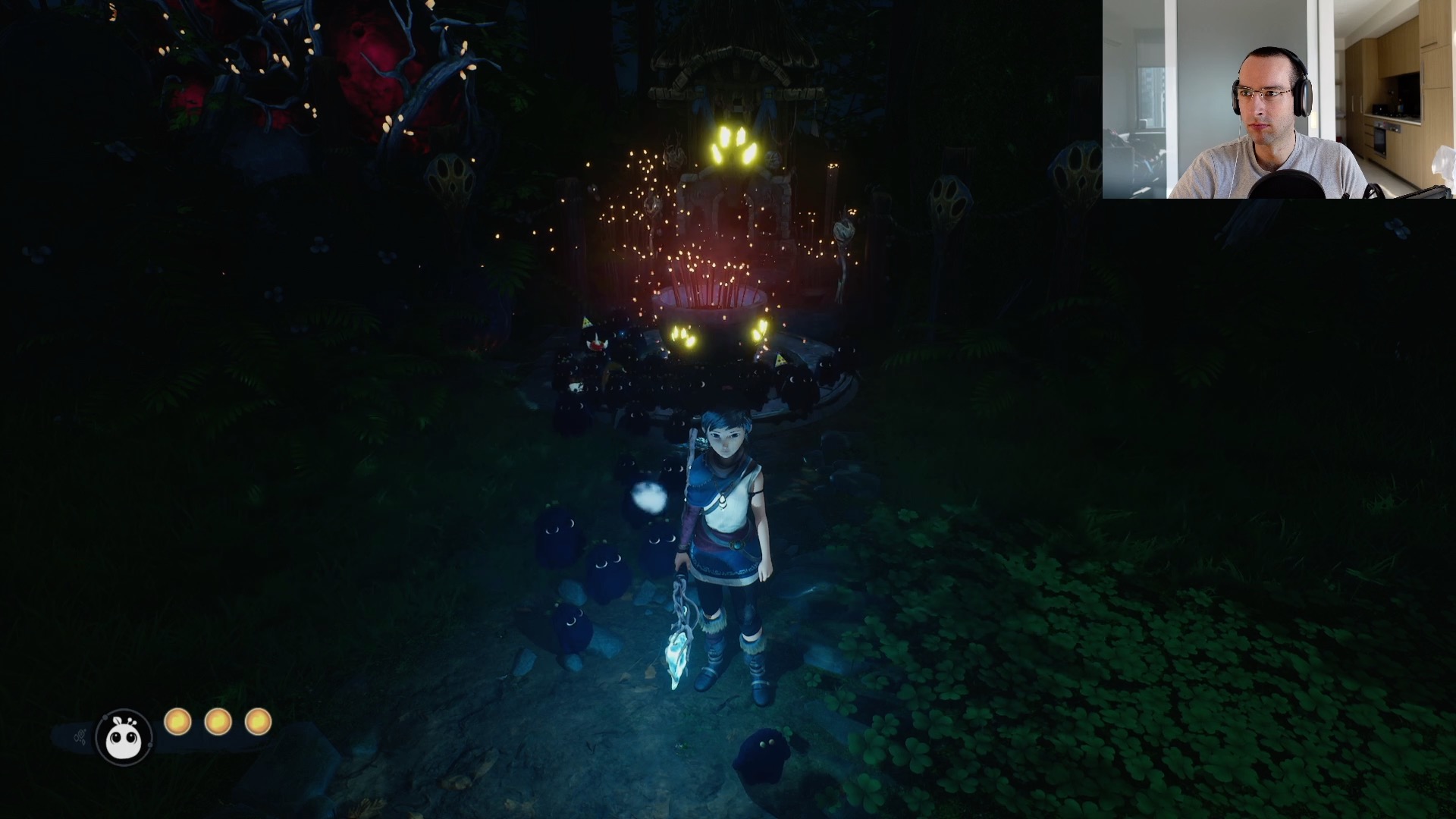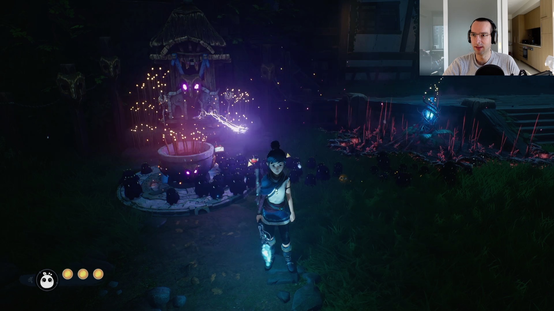 To open the door to the Mask Maker’s House in Mask Maker’s Path in Toshi’s Fear in Kena: Bridge of Spirits move each of the bowls to the shrine based on the matching mask on the shrine and the side of the bowl. Put the bowl with the 4 eyed mask in front of the shrine which also has the masks with 4 eyes. You will know that you put the bowl infant of the wrong shrine because some enemies will spawn. You will know you have picked the right shrine because the eyes in the mask will light up.