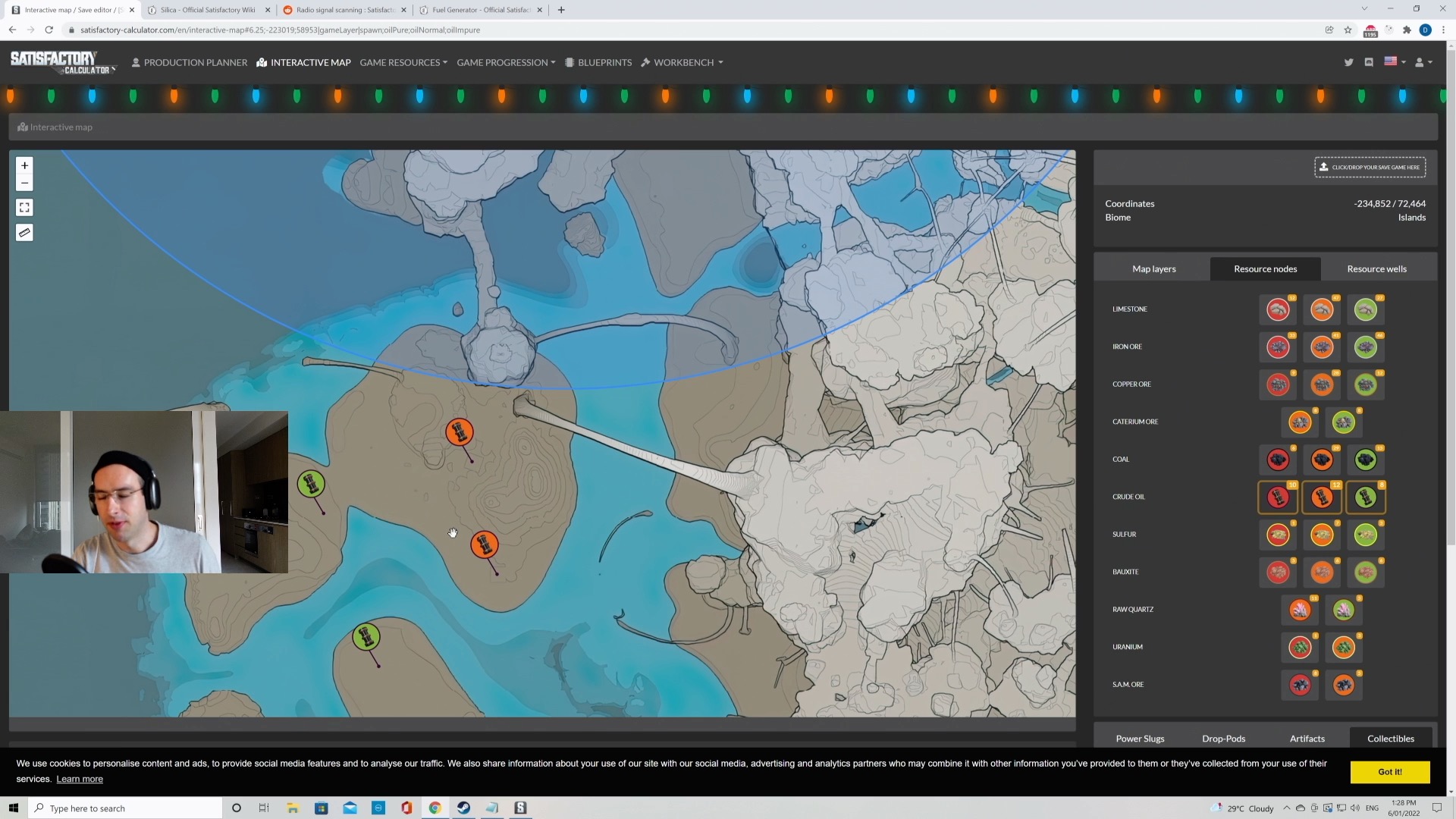 Starting with a good location. We only need a good location with oil wells. There is an interactive map available here: https://satisfactory-calculator.com/en/interactive-map. Turn on only the oil resources nodes and spawn locations. The spawn location will be shown as large blue circles which will help you orient yourself. We will be picking a nice location near our spawn location with 2 each pure and normal oil nodes.