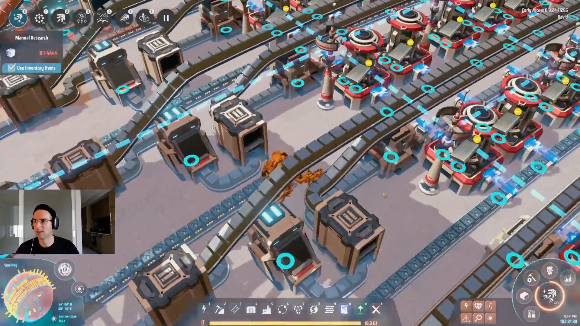 I usually separate production lines to dedicated planets for smelting, chemistry and assembling. This means that only certain buildings are needed on that planet and all of the production lines are quite similar. All of our production lines are quite similar where they take some input lines, where we will assume that all the technologies for piling items 4 high have been unlocked, and then have to combine single piled output lines into 4 piled output lines to be fed into a transportation station. I usually do this using 4 segmented production lines where each segment produces enough output to fill up a Mk.III conveyor belt (30 items per second). These are then fed into a pillar and drawn to the front of the production lines. That is where splitters and Automatic Pilers are used to produce a single full conveyor belt stacked 4 items high. All of the input and output conveyor belts are then fed through a spray coater using Mk.III proliferator.
